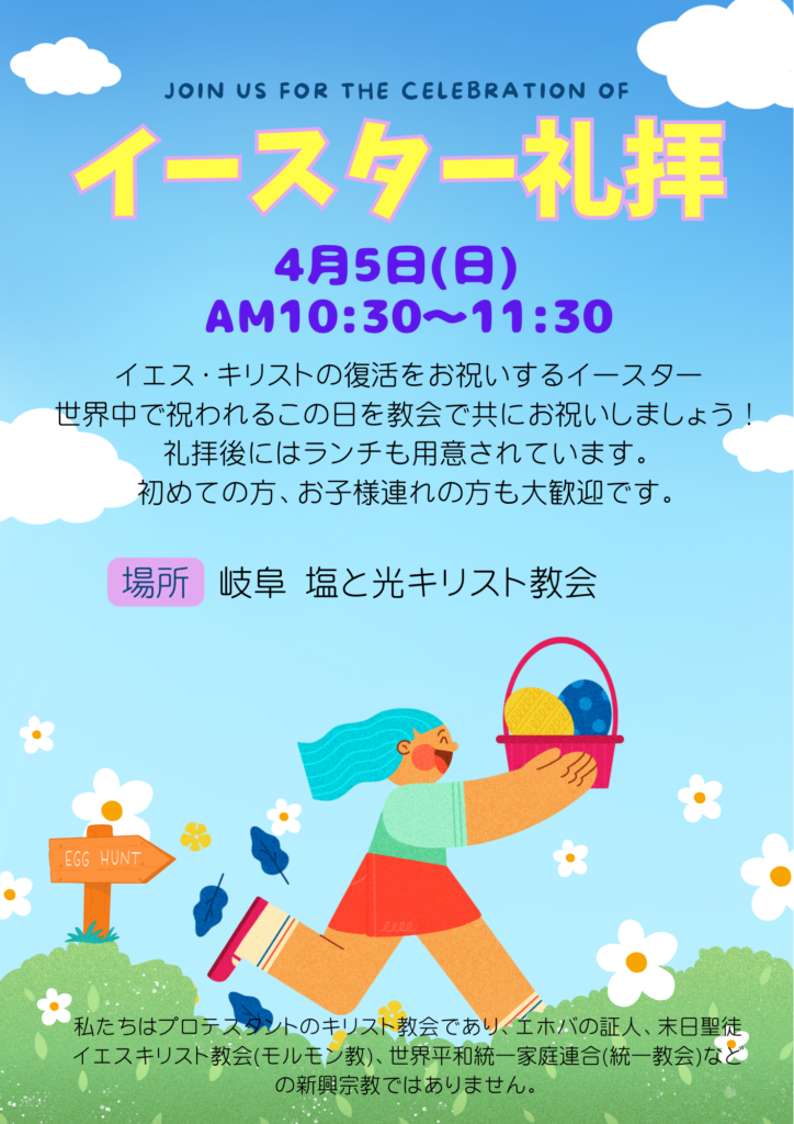 イエス・キリストの復活をお祝いするイースター礼拝です。ぜひ教会で一緒にお祝いしましょう。